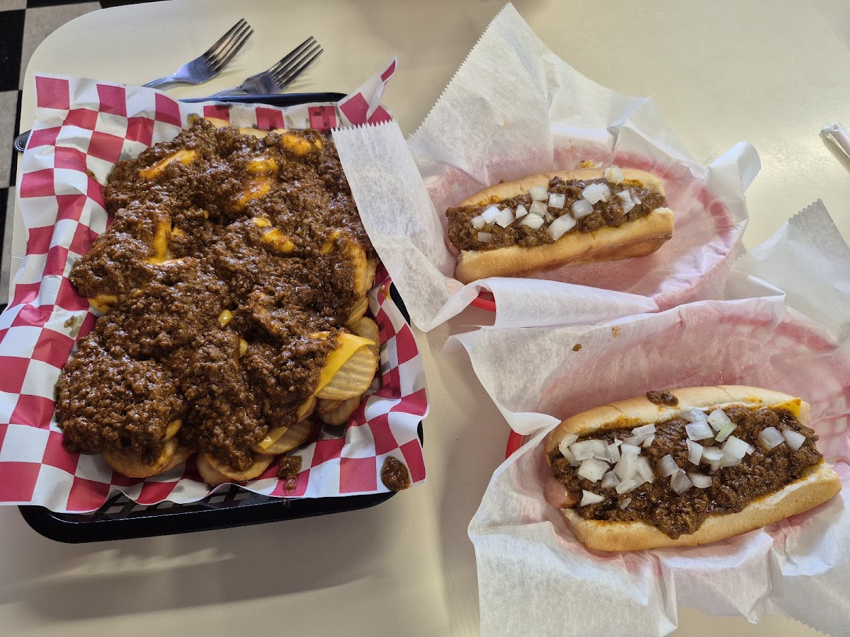 OMG! I am only here for a couple of days, visiting family. When I come back this will be a regular stop! The chili is amazing. Coney with cheese is where it is at! All those things were great, BUT THE FRIES ARE AMAZING! I got chili cheese fries and they were to die for! I am going to keep bugging them for t-shirts. The place has been around since 1936! I am so glad I could enjoy this slice of heaven! Fantastic service! They accept debit cards. 3 bucks for a coney, and 350 with cheese. 7 for the chili cheese fries, but trust me you will not be disappointed. Hand cut cottage fries! Simply the best. I will dream of those fries until I come back! Strong work, I will see you again!